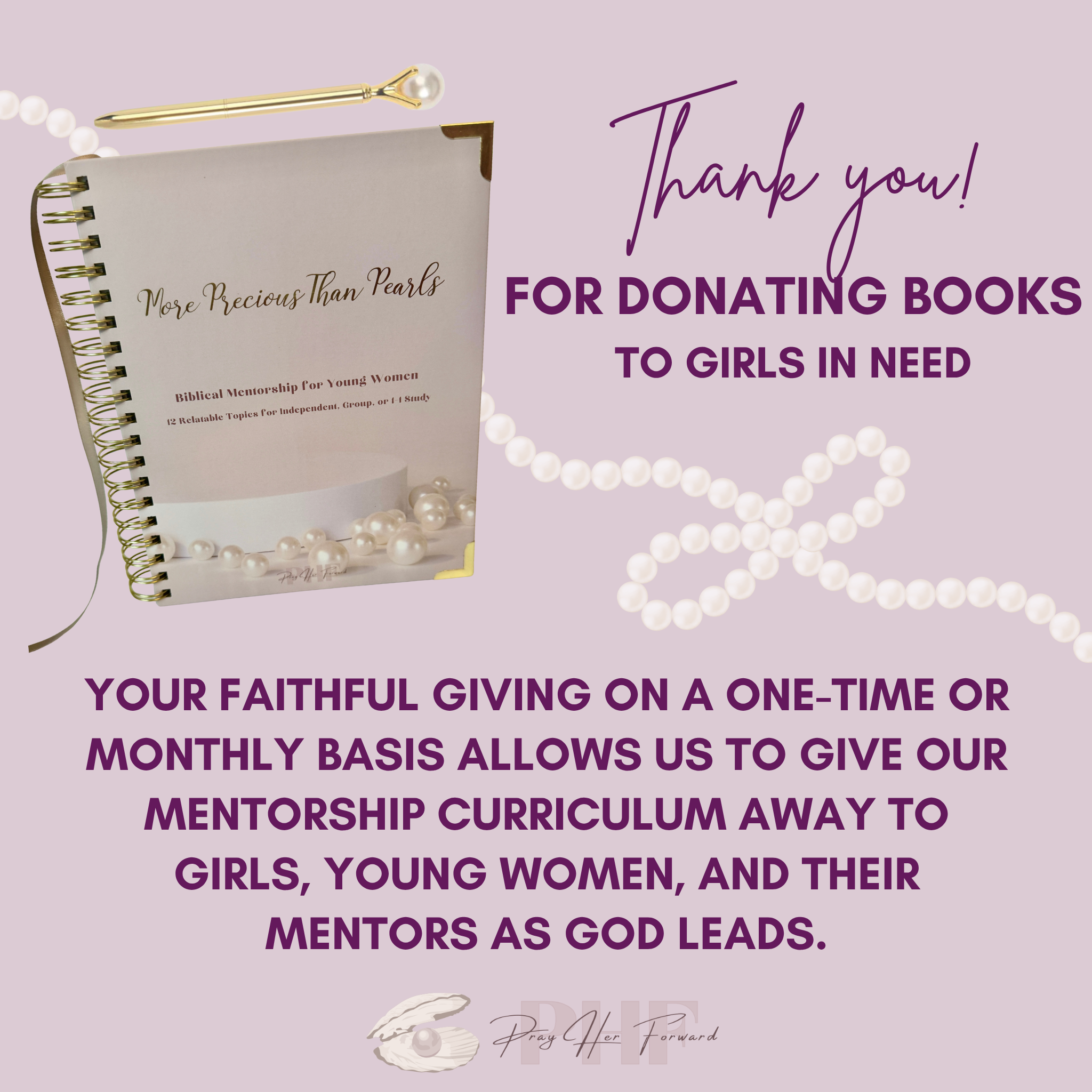 Thank you so much for your prayers and support for the ministry of Pray Her Forward. If you feel led to partner with us by donating books, please prayerfully consider one of the options below. You may give a one-time gift to provide books for girls in need or choose to give on a monthly basis.